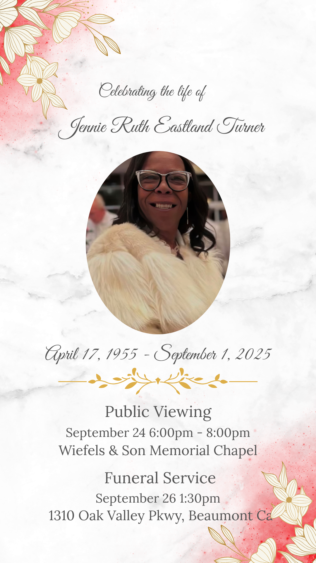 Dr. Jennie Ruth Eastland Turner, longtime member of the IDMR Banning Branch, passed away peacefully at home on September 1, 2025. She was the mother of Dr. Nashala Bryd, sister of Drs. Jackie Allen, Carnell White, Karen Bryant, all of the IDMR Banning Branch, and Patricia Nelson, Dean of IDMR Banning and International Trustee Board Member. A Public Viewing will be held Wednesday, September 24, 2025, from 6:00 pm – 8:00 pm at Wiefels & Son Memorial Chapel, 50 East Nicolet Street, Banning, CA 92220. A Memorial Service will be held Friday, September 26, 2025, at 1:30 pm at Albert A. Chatigny Sr. Community Recreation Center, 1310 Oak Valley Parkway, Beaumont, CA 92223. Expressions of condolences may be sent to her daughter, Dr. Nashala Bryd, 1524 Big Sky Drive, Beaumont, CA 92223. Watch the Live Stream Here. Live Stream part 2. View Announcement here.